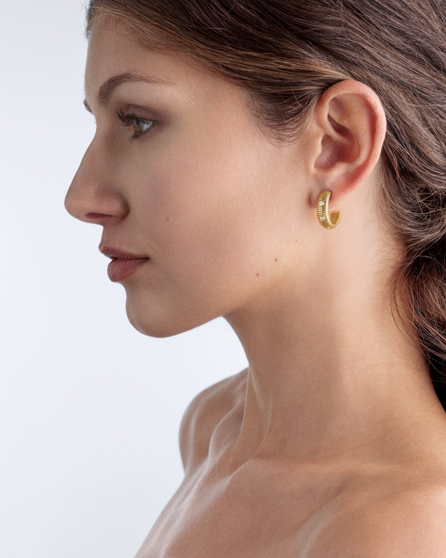 Textural bands and hoops set with bright diamonds. This is Clio. Classic in nature but with a modern twist, these new favorites are designed to be worn daily.