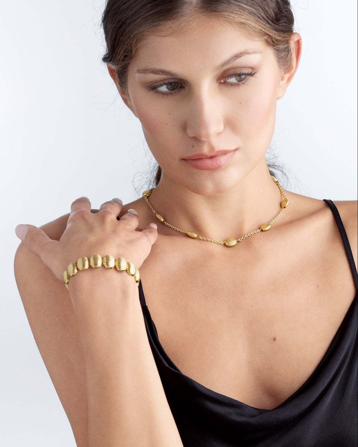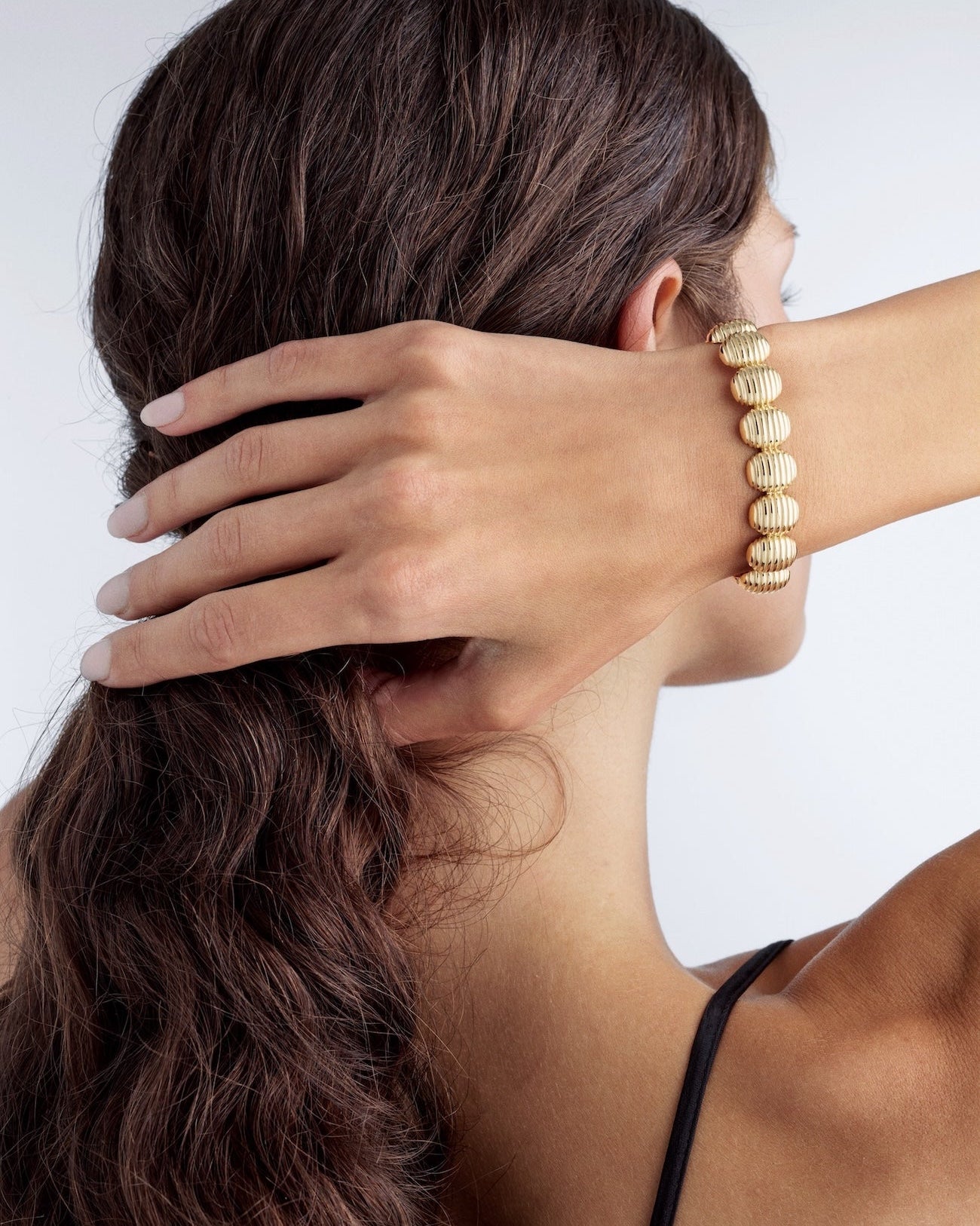 Isla brings form to Pamela’s love of working with texture and shape. A gleaming finish of polished ridges and sandblasted channels evoke both the nobility of ancient worlds and the glamour of the 70s.