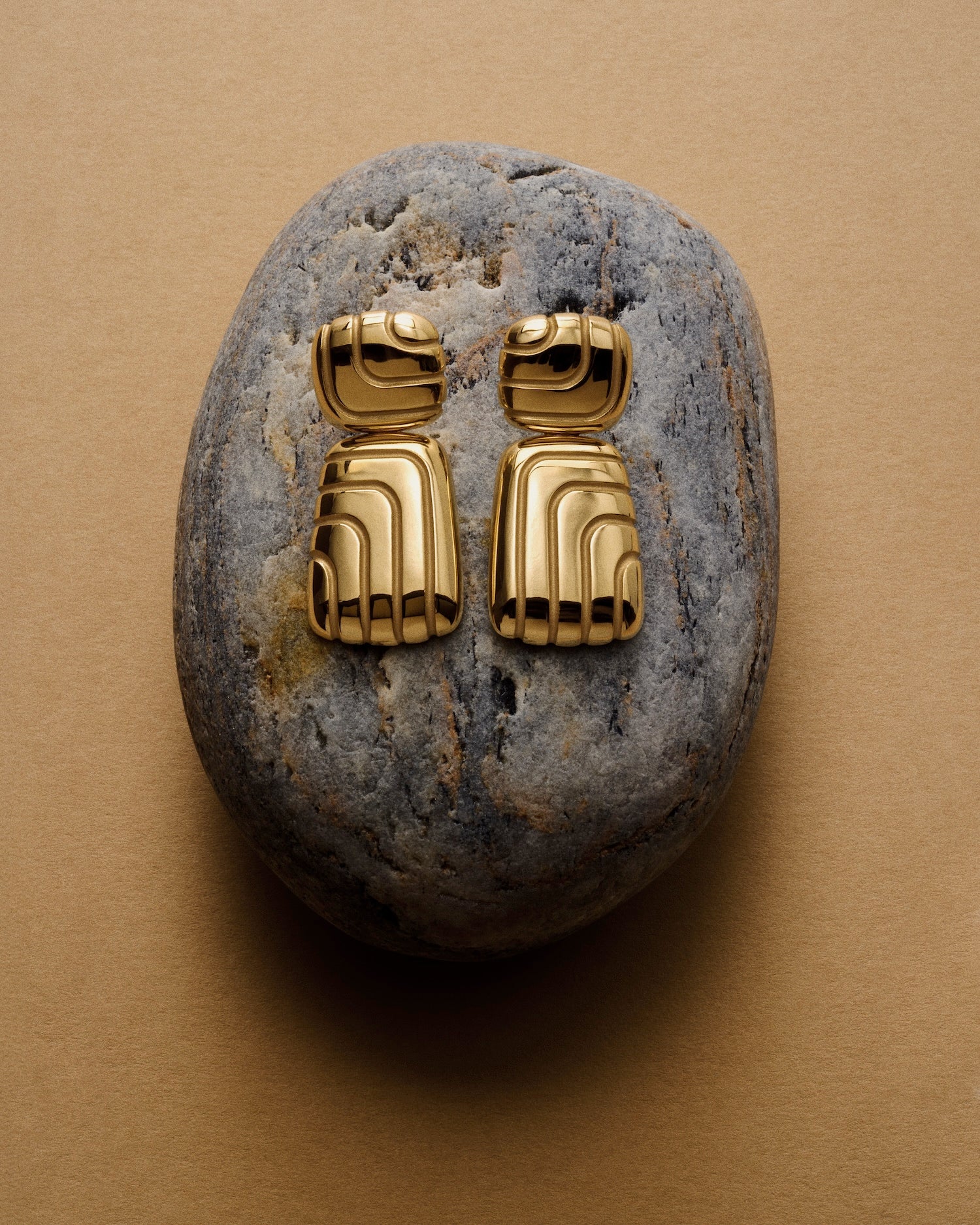 The Labyrinth Collection pays homage to the glamour and cool lines of the 1970’s, with sleek curved ridges sculpted across gently domed surfaces of gold. Think sunken living rooms and Frank Stella's Harran ll.