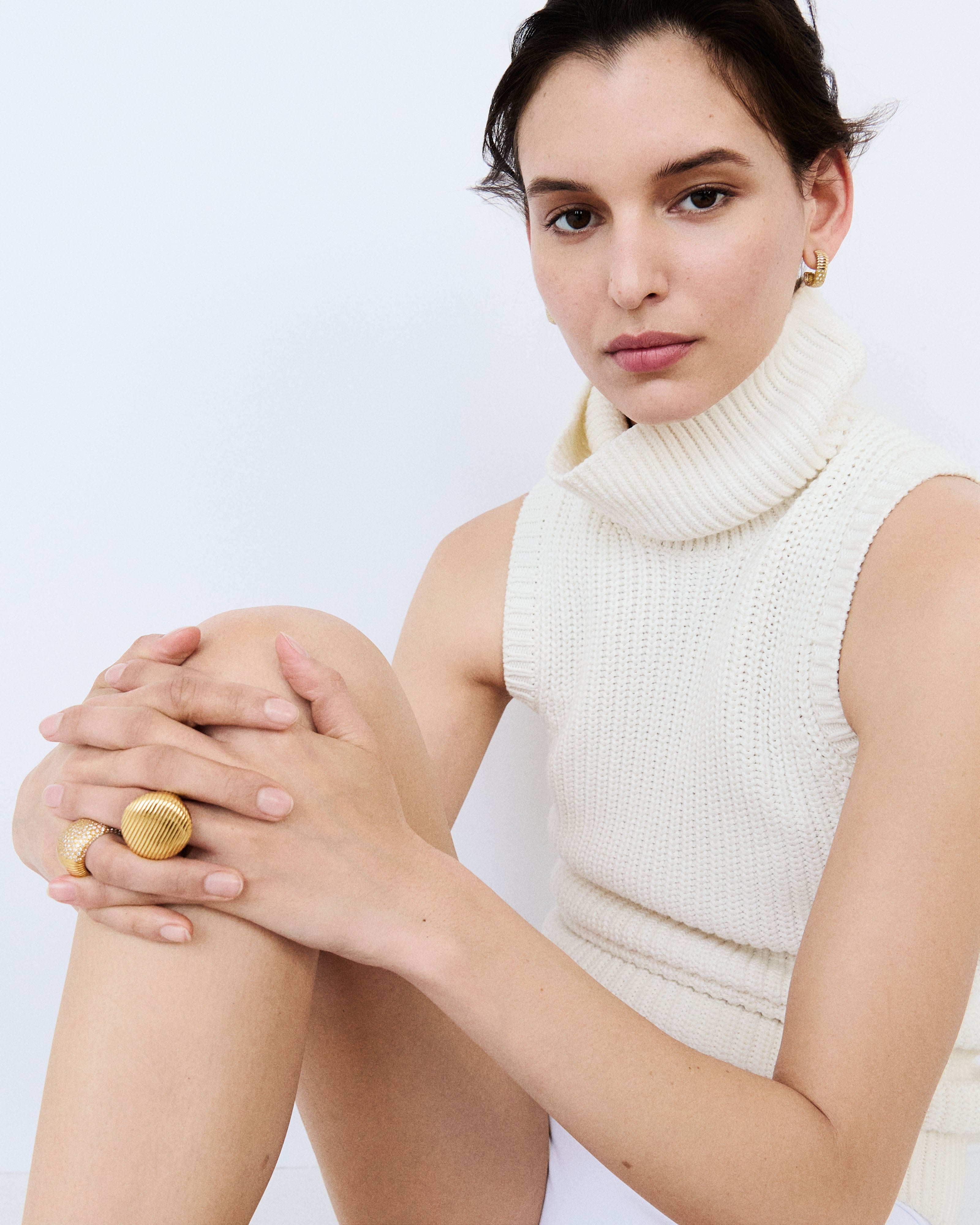 Isla brings form to Pamela’s love of working with texture and shape. A gleaming finish of polished ridges and sandblasted channels evoke both the nobility of ancient worlds and the glamour of the 70s.